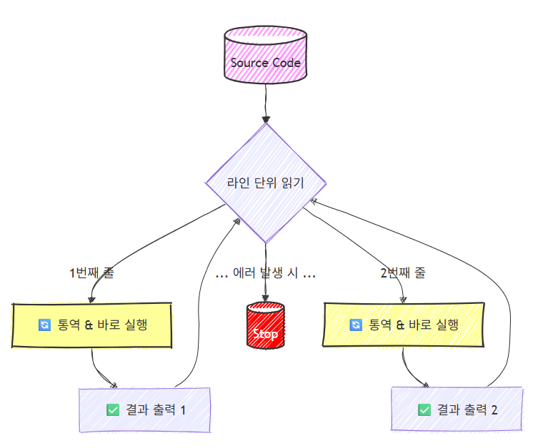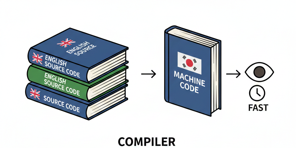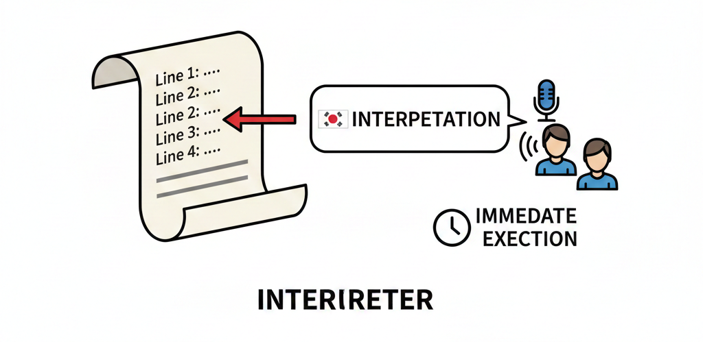 | 영어로 된 두꺼운 책(소스 코드)을 받아서, 한꺼번에 한글 책(기계어)으로 번역 | 영어 문장을 한 줄씩 듣고, 그 자리에서 바로 한글로 통역 |